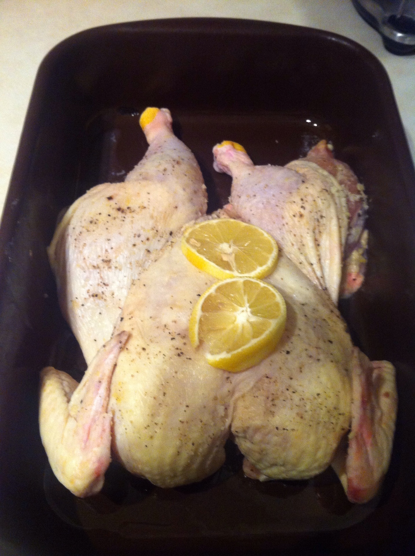 - Place the chicken skin side up in a roasting pan then place two or three lemon slices on top.