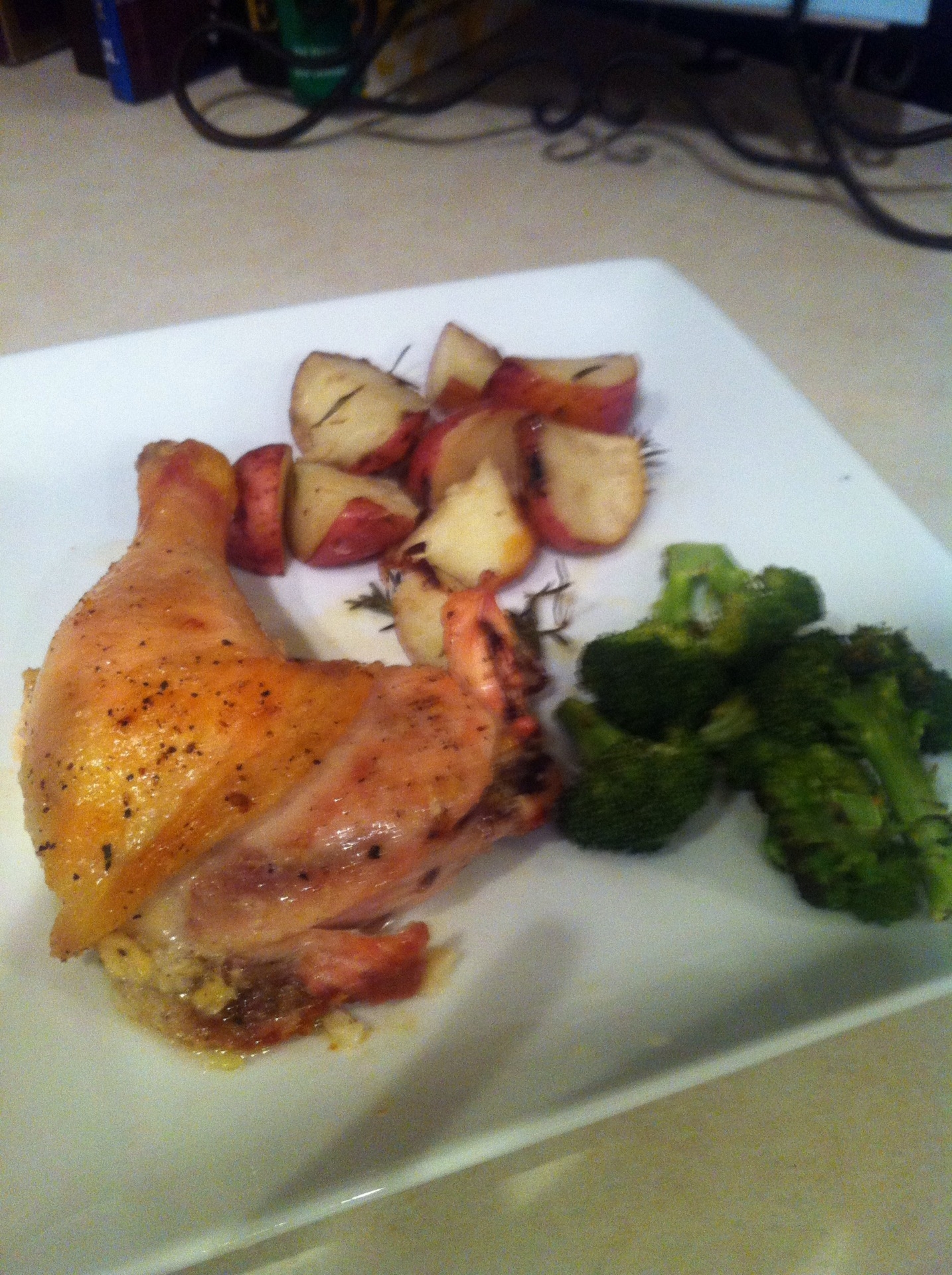Last night I baked a chicken. This in itself is really not that impressive, but I am rather pleased with the way that things turned out. I cook, well, prepare food, for dinner on a regular basis, but this chicken baking experience took things to a whole new level. Usually, my cooking consists of grilling fish or chicken and making an easy veggie to go along, but I felt like I was actually cooking a real meal last night.