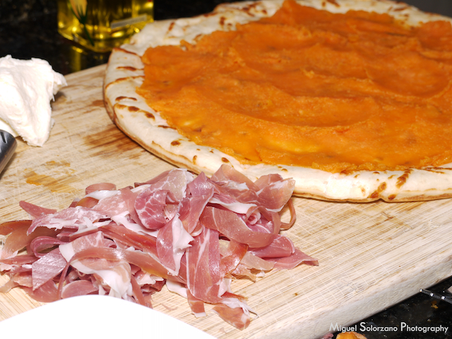 - Spread the mashed sweet potatoes over the pizza crust then top with mozzarella, onions and prosciutto.