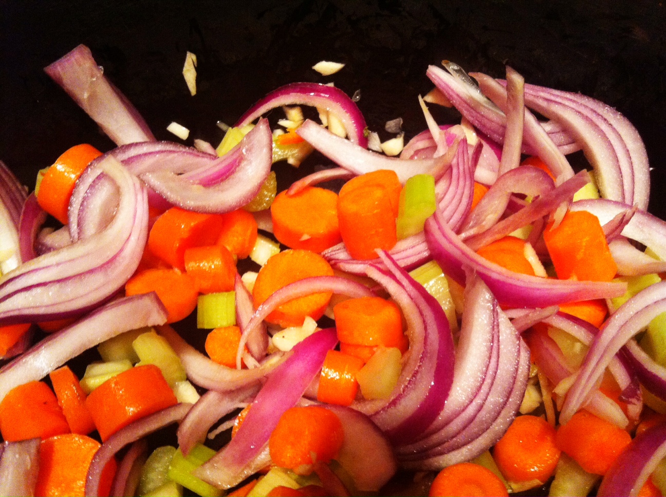 - Meanwhile, in large stockpot, saute onion and garlic with olive oil over medium heat until onions are translucent.
