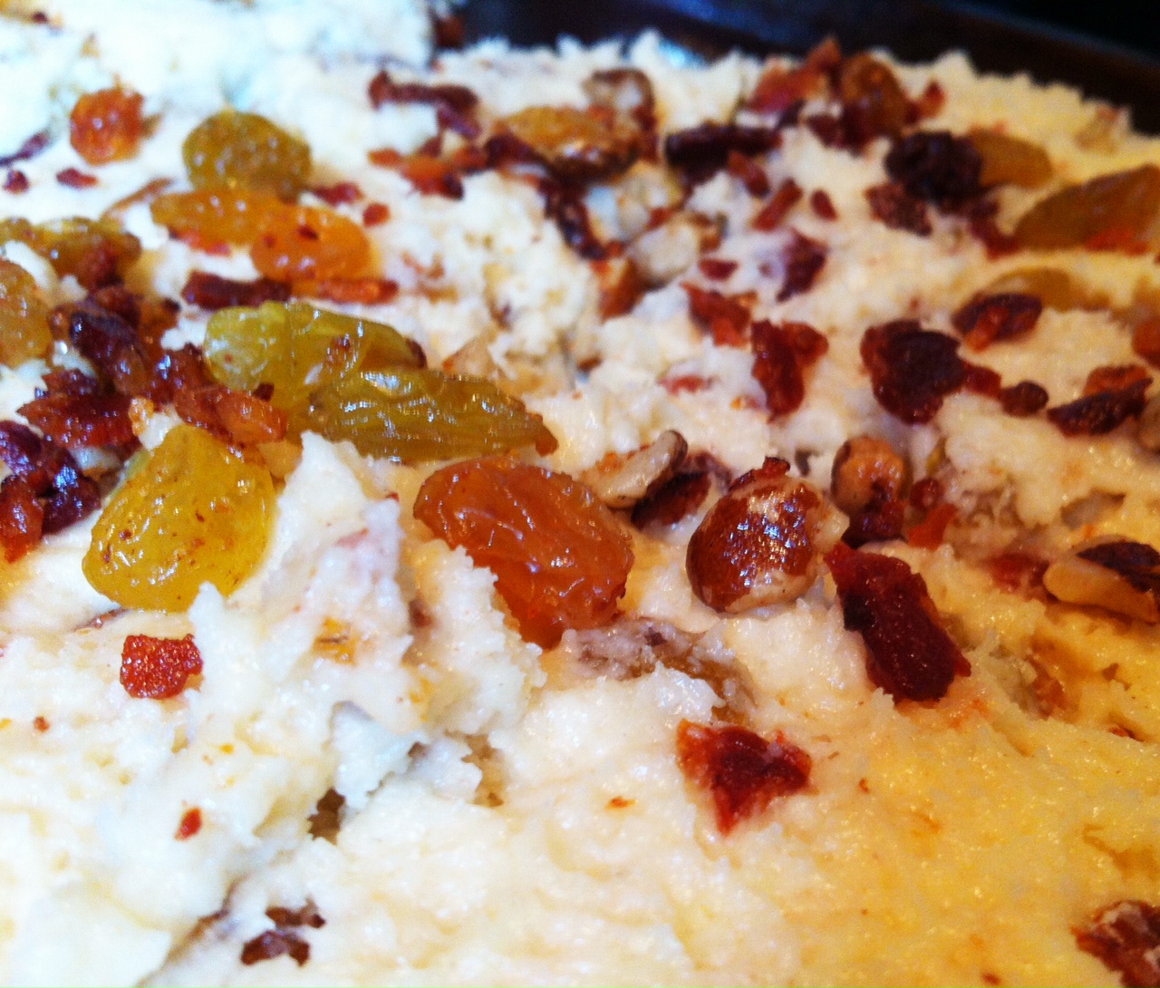 - In a small bowl, combine bacon, golden raisins and walnuts.
