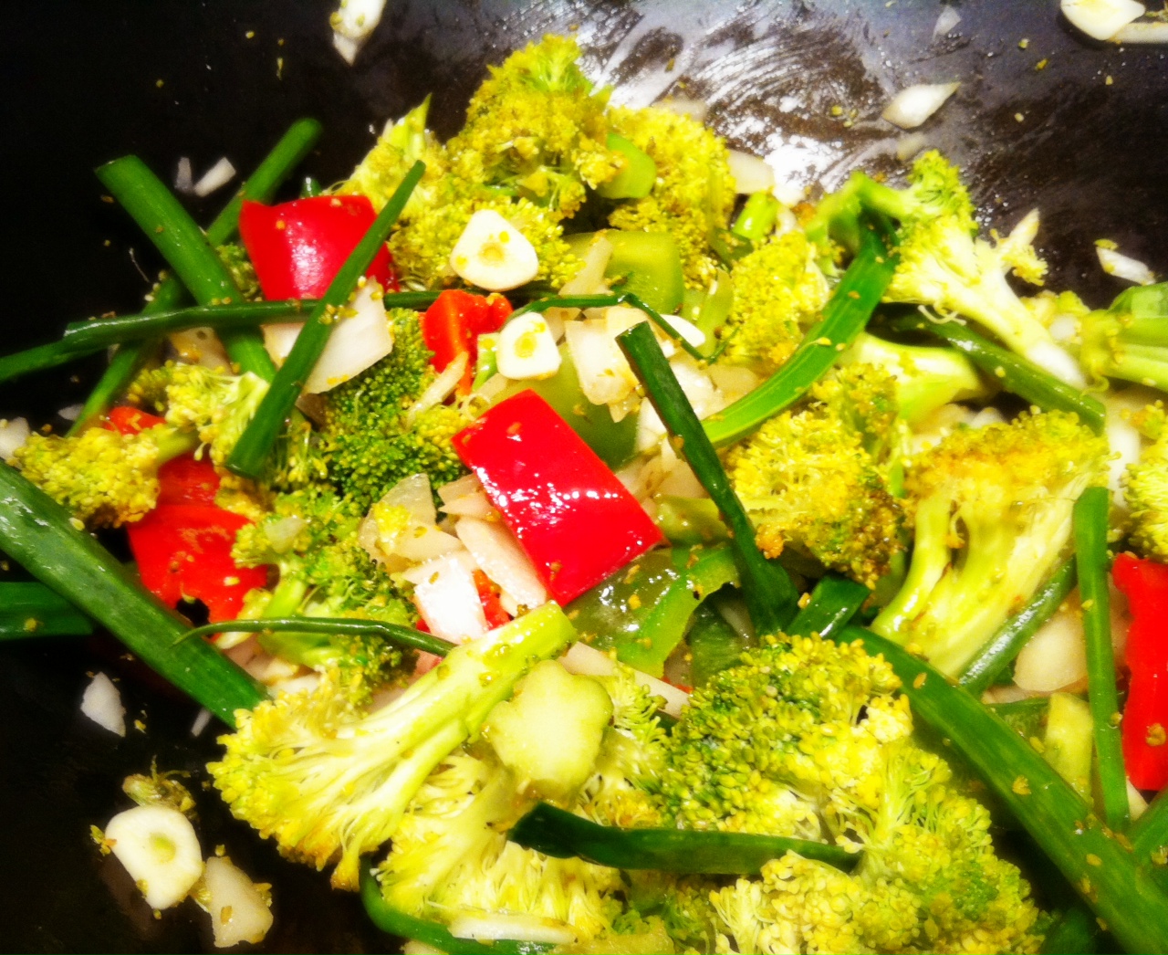 - In a wok or large pan, saute the onion, garlic, red pepper, broccoli and green onion in oil over medium-high heat for about two minutes.