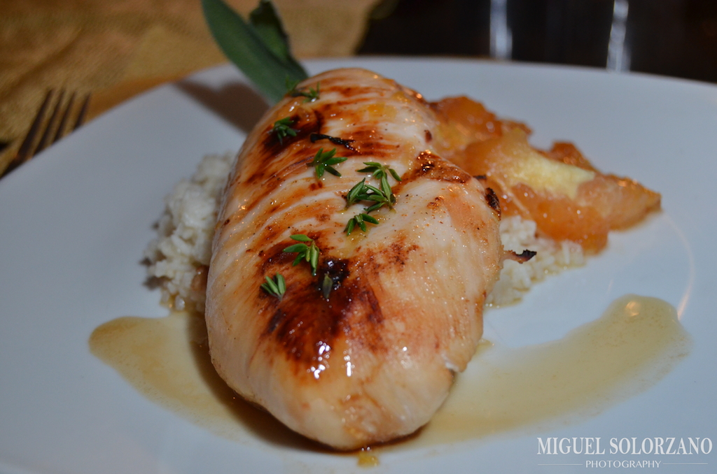 - Serve chicken breasts over rice, finishing with the grapefruit wedges and reduction sauce.