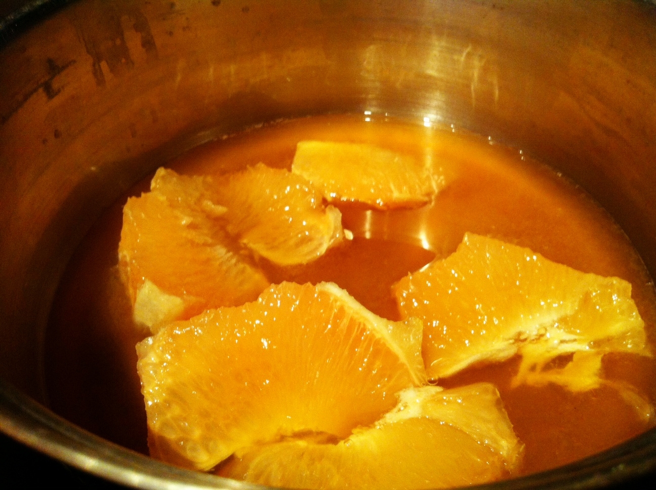 - For the second grapefruit, cut it into sections making sure to cut off any of the pith (white stuff). Place the segments in a medium saute pan.
