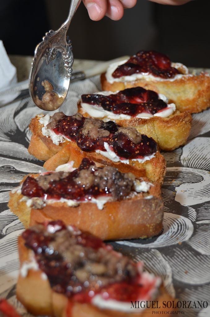 - Once bread is toasted, fig jam has cooled and bone marrow has been extracted, prepare the toast by spreading goat cheese on first, followed by fig jam and top with roasted bone marrow.